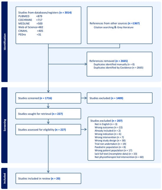 The PRISMA flow chart (Figure 1) summarises search results and the methodological steps to arrive at the included studies. The search yielded 4381 articles with the respective numbers for each database, as shown on the PRISMA flow chart (Figure 1). After removing the duplicates, 1716 studies remained and were screened for eligibility. After screening titles and abstracts, 227 articles were deemed potentially eligible. Following full-text screening, 20 studies were included in this review. Reasons for exclusions are documented on the PRISMA flow chart.