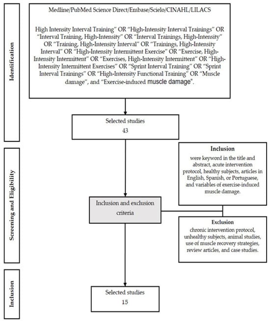 The systematic search was performed using electronic databases in Medline/PubMed/Science Direct/Embase/Scielo/CINAHL/LILACS, and the following words as descriptors: “High Intensity Interval Training” OR “High-Intensity Interval Trainings” OR “Interval Training, High-Intensity” OR “Interval Trainings, High-Intensity” OR “Training, High-Intensity Interval” OR “Trainings, High-Intensity Interval” OR “High-Intensity Intermittent Exercise” OR “Exercise, High-Intensity Intermittent” OR “Exercises, High-Intensity Intermittent” OR “High-Intensity Intermittent Exercises” OR “Sprint Interval Training” OR “Sprint Interval Trainings” OR “High-Intensity Functional Training” OR “Muscle damage”, and “Exercise-induced muscle damage”. The search was conducted from 5 June to 18 September 2023.