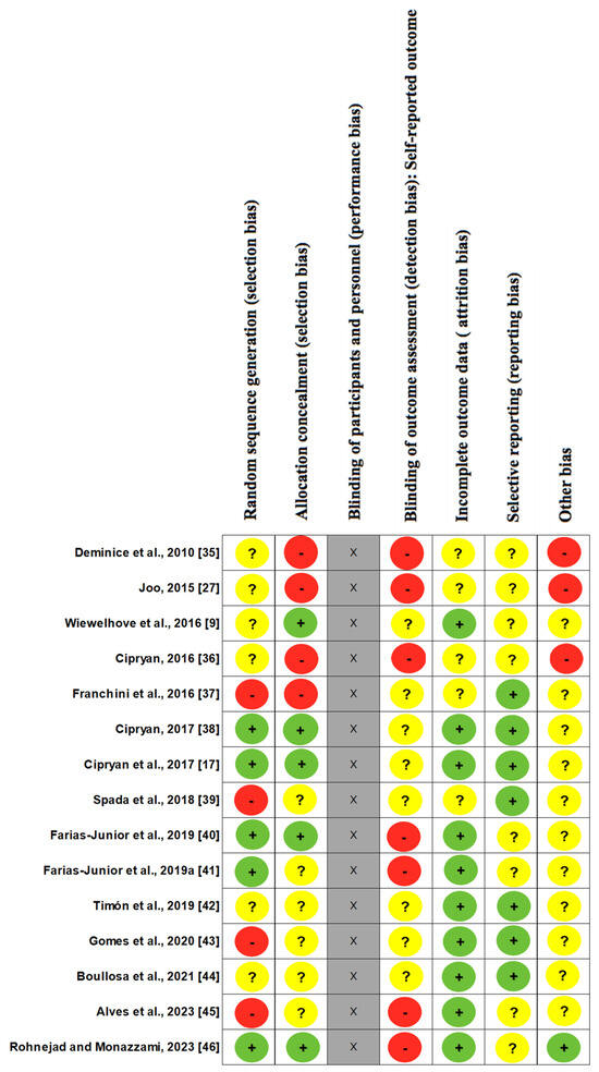 Three reviewers (C.D.F.C.L., P.V.C.Z., and B.M.B.) independently appraised the methodological quality of the studies using Jadad score [32] and risk of bias (RoB-2) using Cochrane tool reported in the Cochrane Collaboration handbook [33]. Differences in opinion regarding the RoB-2 and Jadad were resolved through discussion between the reviewers until reaching a consensus. If differences persisted, a third reviewer was consulted to obtain consensus through discussion or arbitrage [34]. The Jadad score consisted of three items: randomization (0–2 points), blinding (0–2 points), and dropouts and withdrawals (0–1 points). The response to each item was either “yes” (1 point) or “no” (0 points). The final score ranged from 0 to 5 points, with higher scores indicating better reporting. Studies with a Jadad score of 2 or less were considered to have low quality and those with a Jadad score of 3 or more were considered to have high quality [32]. The RoB-2 tool comprises six domains: (1) selection bias (e.g., random sequence generation and allocation concealment), (2) performance bias (e.g., blinding of participants), (3) detection bias (e.g., blinding of outcome assessment), (4) attrition bias (e.g., incomplete outcome data), (5) reporting bias (e.g., selective reporting), and (6) other biases. This tool enables researchers to assign a quality score of “high”, “low”, or “unclear” risk based on seven factors that might cause the effect of treatment to be overestimated or underestimated in individual studies.