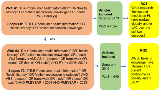 (1) In the first step, a set of commands was used to identify studies on health literacy indexed in Scopus and WoS (filtering out was conducted by document type article) for 2005–2022. We used three HL-related terms retrieved from the controlled vocabulary NLM MeSH [26].