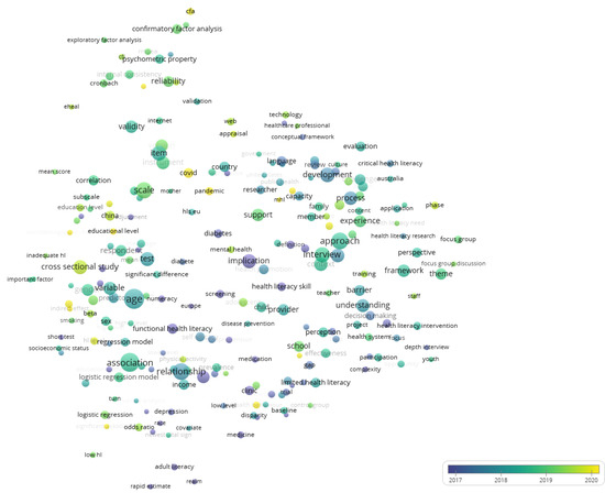 Figure 4 illustrates how the HL research themes and concepts have evolved over the last three years. In 2017, the topics researched were explicitly related to HL; i.e., “low HL”, “functional HL”, and “adult HL”; these are the variables represented in the dark blue bubbles at the bottom of the figure. More recently, in 2020, the research focus has moved to more contextual areas surrounding HL, such as the “covid” and “pandemic” variables indicated by the yellow bubbles. In between these years (green bubbles in Figure 4), the focus seems to have been on variables such as “age” and “tests” of HL interventions.
