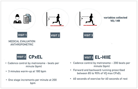 Participants visited the laboratory three times, with each visit separated by an interval of seven days, during morning hours (7:00 a.m. and 10:30 a.m.). Medical and anthropometric assessment were performed on the first visit. On the second visit, all participants performed the CPxEL until exhaustion to assess the maximal oxygen consumption and prescribed intensity of EL-HIIE. On the third visit, participants performed the EL-HIIE session (Figure 1).