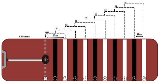 Schematic of the rubberized mat (length of 4.50 m) demarcated with 11 lines (0–10)—30 cm between lines. S0 (WU) and 8 (eight) stages (S1 to S8)—60 cm between stages, interspersed with black and white colors. WU: warm-up. Source: [12].