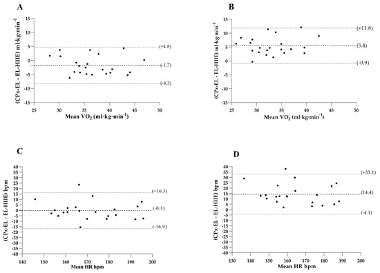 The present study, in addition, monitored HR during EL-HIIE. In sports practice, the use of this metric is frequent, although the literature points out that there may be limitations, mainly due to the delay in changes in the heart rate at the beginning of the exercise [18]. Our findings demonstrated good agreement between the HRsession (peak) of the exercise session and the HR CPxEL prescription. Therefore, this evidence points out that monitoring HRsession (peak) in EL-HIIE ensured that participants were at an intensity equivalent to the specific test prescription (CPxEL).