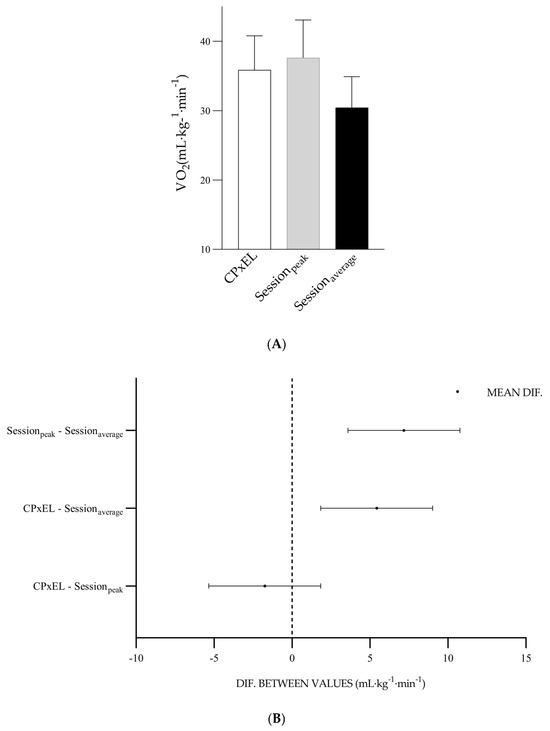 (A) Values and standard deviation of VO2CPxEL, VO2session (peak) EL-HIIE, and VO2session (average) EL-HIIE. (B) Graph of the difference between the mean values of VO2CPxEL, VO2session (peak) EL-HIIE, and VO2session (average) EL-HIIE. X-axis: difference between the values.
