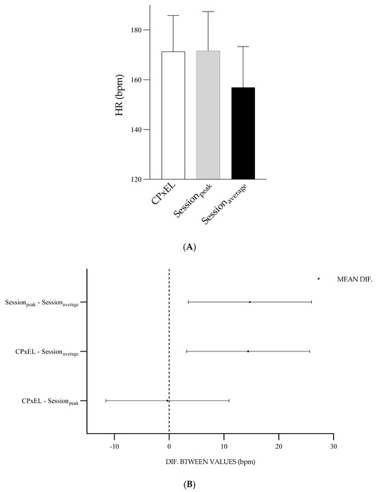 (A) Values and standard deviation of HRCPxEL, HRsession (peak), and HRsession (average). (B) Graph of the differences between the mean values of HRCPxEL, HRsession (peak)EL-HIIE, and HRsession (average). X-axis: the difference between the values.
