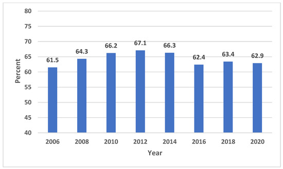 In 2020, CWSs supplied water to over 287 million individuals in the US, and 72.7% of those individuals received CWS-supplied fluoridated water. In comparison, the percentage of the US population who received water from CWSs was 69.2% in 2006, and 74.6% in 2012 (Table 1). Among the total US population in 2020, 62.9% received water that met fluoridation standards. The percentage of those receiving fluoridated water ranged from a low of 61.5% in 2006 to a high of 67.1% in 2012 (Figure 1).