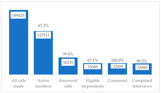 We made 189,425 calls between July and December 2021; 67.3% (n = 127,511) were active numbers. Nearly 39.4% (n = 50,235) of the active numbers were answered; 67.1% (n = 33,688) were eligible for study participation. All of the eligible respondents consented to study participation, 98.2% (n = 33,080) of whom completed interviews (Figure 1).