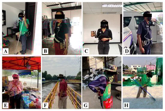 This study evaluated the levels of airborne microplastics to which workers were exposed in various workplace settings. These workplaces were separated into indoor and outdoor environments. In total, eight workplaces were selected, representing common daily working locations, i.e., roadside, waste separation plants (WSPs), buildings, dormitories, and wastewater treatment plants (WWTPs). The sample groups in indoor environments comprised housekeepers, laundromat staff, office workers, and van drivers. On the other hand, the sample groups in outdoor environments included street vendors, maintenance technicians in WWTPs, waste segregation officers at the waste separation plant in the university, and waste segregation officers at the waste separation plant in the market. In this context, three samples were collected for each sample group. Figure 1 shows photographs of each sample group in this study, and the number of samples for each group is provided in Table 1.