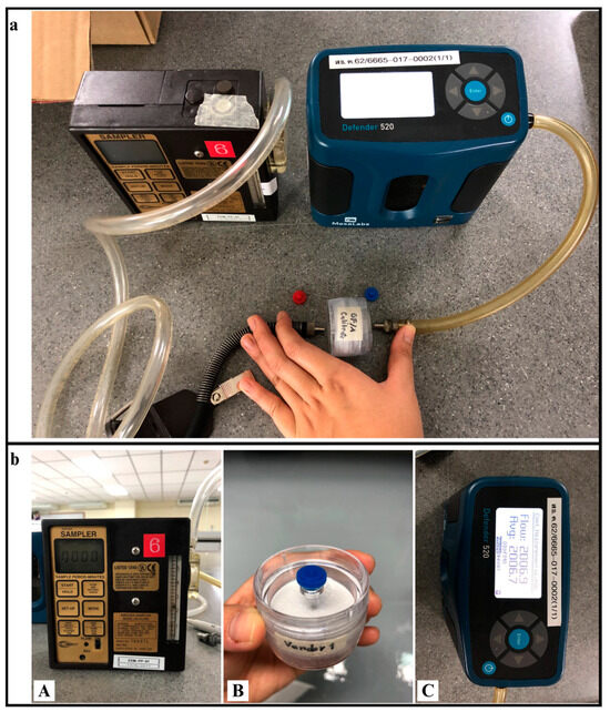 (a) The personal air sampler; (b) component of the personal air sampler: (A) personal air sampling pump; (B) GF/A pad placed in cassette filter; (C) pump calibration equipment.