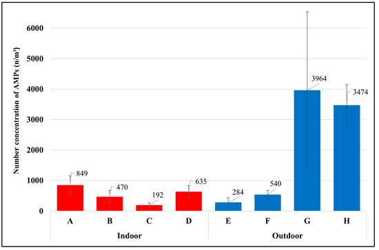Number concentration of AMPs in each occupational group (mean ± S.D.); (A) housekeeper, (B) laundromat staff, (C) Office worker, (D) van driver, (E) street vendor, (F) maintenance technician in the WWTP, (G) waste segregation officer in the university, (H) waste segregation officer in the market.