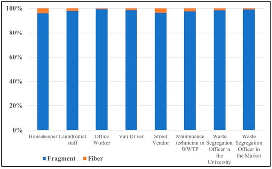 From Figure 5, all occupation groups have the potential to inhale microplastics in a fragment shape, ranging from 96.2% to 99.5% of the total number of airborne microplastics. These fragment microplastics are expected to be secondary microplastics resulting from plastic material degradation or microplastic fragmentation [20,21]. The fiber-shape microplastics accounted for 0.5% to 3.8% of the total airborne microplastics, which may have originated from synthetic textiles or fabric tearing [4,22].