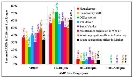 Microplastics larger than 100 µm accounted for less than 10% of all AMP exposure during working hours, and should involve less health concern since they can be removed by self-cleaning mechanisms of the human body and deposition by Earth’s gravity. However, caution should be exercised when workers are exposed to sizable microplastics in close proximity to the sources of airborne microplastics.