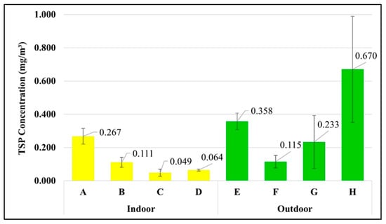 Concentration of TSP in each occupational group (mean ± S.D.): (A) housekeeper, (B) laundromat staff, (C) office worker, (D) van driver, (E) street vendor, (F) maintenance technician in the WWTP, (G) waste segregation officer in the university, and (H) waste segregation officer in the market.