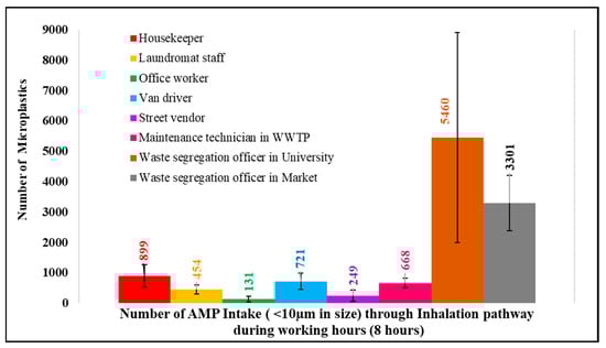 To estimate microplastic intake through inhalation pathways during working hours, the human breathing rate of 6 L/min [10,30] was applied. In addition, only microplastics smaller than 10 µm were considered for this calculation, as these particles are breathable and can deposit in the deep respiratory system, potentially causing impacting on health [10,31,32]. Therefore, during working hours, each occupation has a potential airborne microplastic intake (in numbers), as shown in Figure 9.
