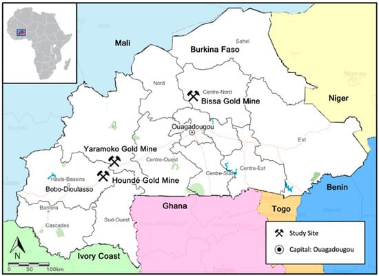 Map of Burkina Faso depicting the location of the three gold mine sites included in the study. (Note: the map was created with ArcGIS Online (2021, Esri Schweiz AG, Zurich, Switzerland), image source: Map data © OpenStreetMap contributors, Map layer by Esri).
