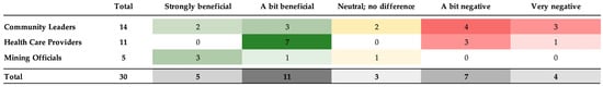 Overall assessment of the perceived impacts of mining on the delivery of health services. (Note: Numbers sorted by different stakeholders; highest color intensity indicates maximum answer quantity; red = negative, green = beneficial, yellow = neutral).