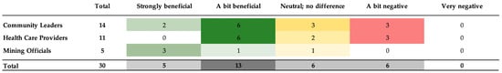 Mining officials assessed their impact on the delivery of health services mostly as strongly beneficial (n = 3), as shown in Figure 4. Also, more than half of community leaders (n = 8) and healthcare providers (n = 6) perceived impacts to be positive. In total, it can be observed that 18 of 30 respondents perceived rather positive effects on healthcare delivery coming from mining, while only 6 of 30 respondents perceived negative effects. However, it must be noted that certain community leaders had difficulties answering the questions on the mining operations’ impacts on healthcare delivery. They stated that they were unaware of the ongoings at the health centers or who were the benefactors of certain donations. Probably due to similar reasons, community leaders’ statements sometimes contradicted those of the healthcare providers. For instance, one community leader said there was no higher workload at the community health center, whereas a healthcare provider said the opposite.