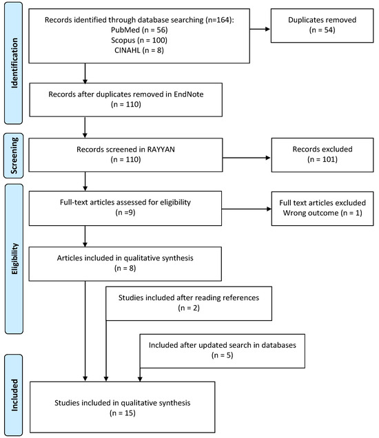 The final study sample consisted of 15 studies (Table 1) published between 2013 and 2023. The initial literature search identified 164 records, and after the removal of 54 duplicates via EndNote 20, [44], the remaining 110 titles and abstracts were imported to the Rayyan review app [45]. After screening titles and abstracts, there were nine articles imported to EndNote in full text. We performed full-text screening for relevance. During this process, one article was excluded because the outcome was irrelevant to the research question. After searching the reference lists of the included articles, we identified and included two additional studies. An updated literature search in April 2023 added five articles that had been published after the initial search. This process is shown in the PRISMA flow diagram (Figure 1).