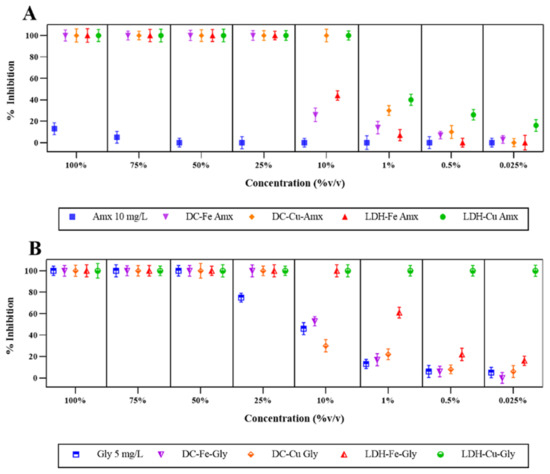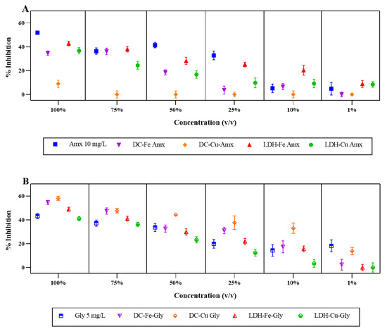 Inhibition percentages of L. sativa presented by the treated and untreated solutions of contaminants. (A) Percentage inhibition of L. sativa with the contaminant amoxicillin (Amx). (B) Percentage inhibition of L. sativa with the contaminant glyphosate. The removal percentages obtained by a Fenton-type process for amoxicillin were DC-Fe (89%), DC-Cu (80%), LDH-Fe (100%), and LDH-Cu (100%), and for glyphosate, they were DC-Fe (26%), DC-Cu (88%), LDH-Fe (30%), and LDH-Cu (71%).