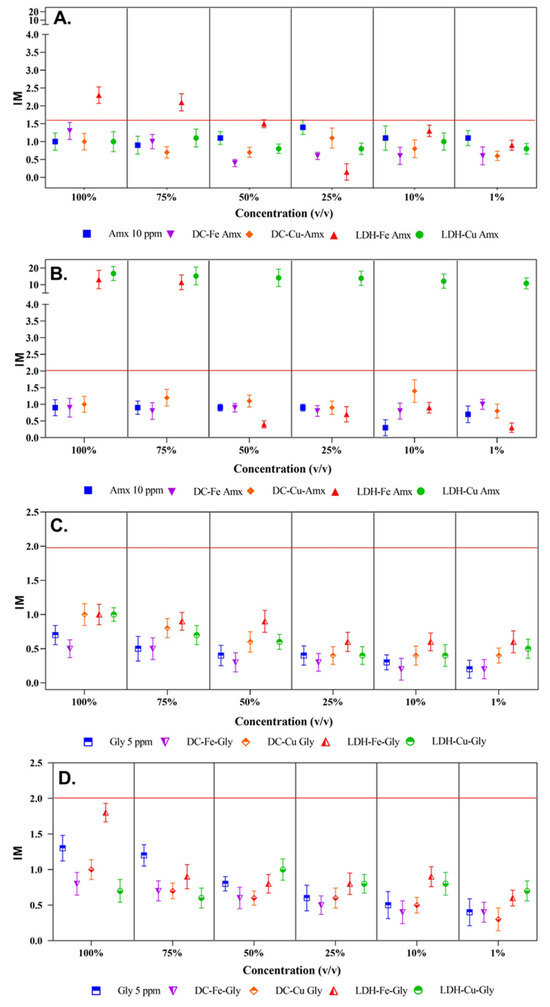 In addition, for the 5 mg/L Gly solution and the LDH-Cu-Gly effluent, a negative effect with 100% mortality was observed only at a concentration of 100% v/v. Therefore, the mortality rates decreased from 75% (v/v) concentration to 0% mortality at 1% (v/v) concentration (Figure 3B). For the DC-Fe-Gly effluent, 100% mortality was observed up to 75% v/v concentration, while the DC-Cu-Gly and LDH-Fe-Gly effluents showed 100% mortality up to 50% v/v concentration (Figure 3B). The LDH and DC effluents impregnated with Fe and Cu showed toxicity levels up to 10% to1% (v/v) concentrations. These results are similar to those reported by Cuhra [61], who evaluated a commercial formulation of glyphosate (Roundup) and where acute toxicity levels are observed even at concentrations below 10 mg/L that induce mortality of D. magna within 48 h [61]. Consistent with previous studies, commercial glyphosate formulations such as the one used in this study may contain adjuvants and/or additives at various concentrations that may increase toxicity compared to the active ingredient glyphosate [61,62]. D. magna, compared to the glyphosate and amoxicillin treatments, presented statistical differences only in samples after 25% (v/v).