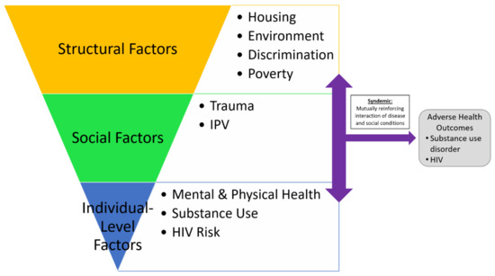 Syndemic theory posits that conditions, such as structural, social, and individual-level factors, are mutually reinforcing and interact leading to adverse health outcomes (see Figure 1) [16,17]. Previous studies found that housing insecurity, such as a lack of access, affordability, and homelessness were related to IPV [18,19,20], substance use [16,21,22], and factors that increased one’s risk of acquiring HIV [23,24,25,26]. There is a dearth of research that has explored housing among BLCW through a syndemics lens. Considering the heightened risk of housing adversity among BLCW, research is urgently needed to better understand factors that are associated with housing to inform interventions for this high-risk, underserved population.