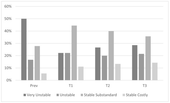 Four categories of housing experiences emerged: (a) very unstable: experienced homelessness, stayed in more than one shelter, or doubled up with different friends/relatives; (b) unstable: stayed in same shelter or transitional housing; (c) stable substandard: lived in the same residence but with substandard conditions, including corroded appliances, limited dumpsters for the number of residents, noise, pests, limited space, and neighborhood disorder; and (d) stable costly: lived in the same residence throughout the study with no indication of moving, but rent was expensive relative to their income. For each participant, we identified their housing experience prior to the first interview (3 months or more before the first interview) and during the first interview, the second interview, and third interview (see Figure 2).