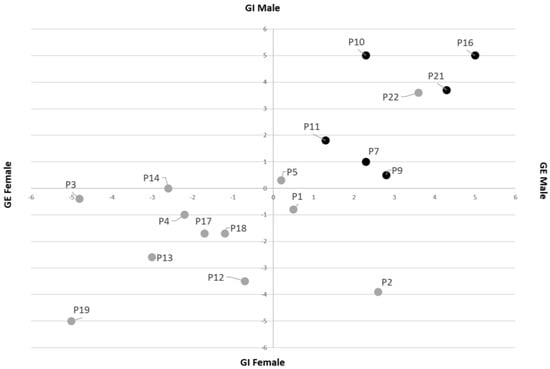| (n = 22) | Total | Female (n = 12) | Male (n = 10) | p-Value | Lower | Upper | Cohen’s d |