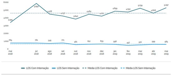 The Length of Stay (LOS) measures the length of stay of the patient in the emergency room. Data were stored from May 2018 to May 2019 and, during this period, the length of stay of patients remained high.