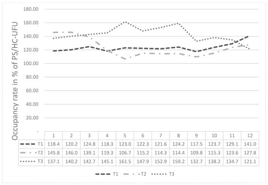 Figure 3 presents the analysis of the general occupancy of PS/HC-UFU, over the period of 36 months, between April 2017 and March 2020, with one year for stage T1 (April 2017 to March 2018), one year for stage 2, T2 (April 2018 to March 2019) and one year for phase T3 (April 2019 to March 2020).