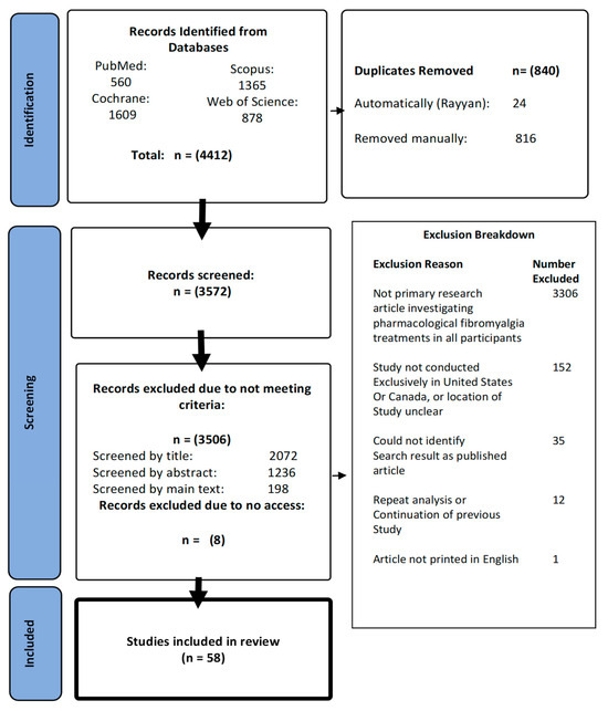 Our searches identified 3572 articles after duplicate removal. We excluded 3506 articles not meeting the eligibility criteria, and eight that could not be accessed, leaving 58 fibromyalgia trials [31,32,33,34,35,36,37,38,39,40,41,42,43,44,45,46,47,48,49,50,51,52,53,54,55,56,57,58,59,60,61,62,63,64,65,66,67,68,69,70,71,72,73,74,75,76,77,78,79,80,81,82,83,84,85,86,87,88] for analysis. For screening details and exclusion reasons, see the PRISMA flowchart (Figure 1). The characteristics of included trials are summarized in (Table 1).