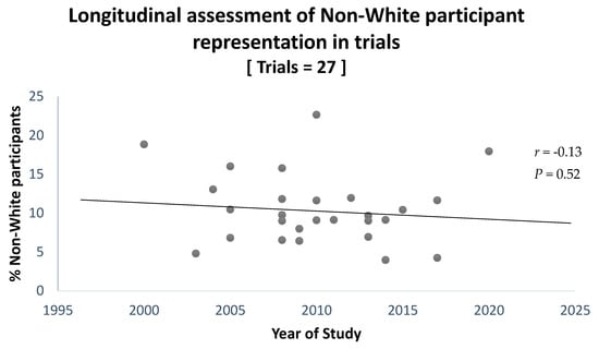3.1.4. Longitudinal Assessment of Non-White Participant Representation in Trials (Objective 3)