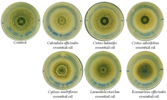 For antifungal activity, potato dextrose agar (PDA; Oxoid, Madrid, Spain) plates were prepared and 100 μL of each essential oil was added and spread over the surface of the plate. After spreading, the plates were allowed to dry under sterile conditions around a flame.