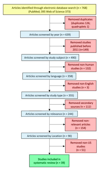 Prior to initiating the literature search, our research team clearly defined our inclusion and exclusion criteria. To ensure relevance to present-day threats of climate change, studies published within the past 10 years were included in the study (2011–2021). Our research team limited inclusion to only research studies focused on human health outcomes. All non-human studies, including laboratory-based animal studies, were excluded from the analysis. We included primary sources published in peer-reviewed journals including cross-sectional and longitudinal studies (retrospective and prospective). Expert committee commentaries and opinion papers were not included in the study. Secondary sources, including narrative reviews, systematic reviews, and meta-analyses, were excluded. Only studies published in English were included. To be included in the review, the publication must have focused on the impact of climate change-related environmental exposures on perinatal or maternal health. Titles and abstracts were screened, and relevant studies were identified. Articles were limited to studies based in the United States. Figure 1 illustrates the implementation of our pre-set inclusion and exclusion criteria for selecting studies for the systematic review.