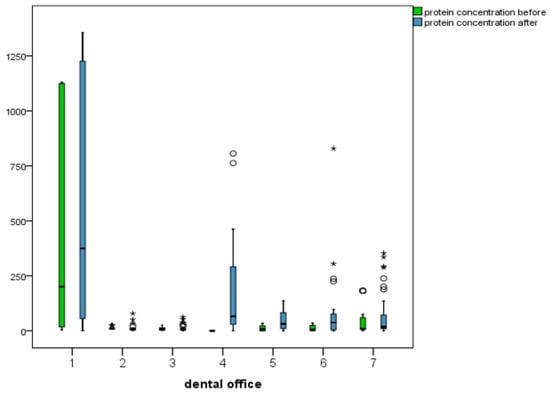 Protein concentrations before and after treatment for each dental office (* and ° for outliers).