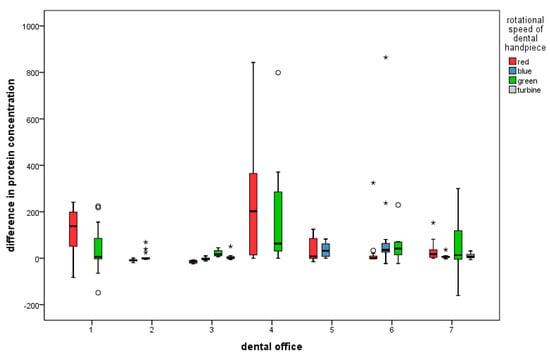 In determining the combined influence of the parameters using regression analysis, the office (p = 0.001) and the office in combination with the type of treatment (p = 0.004) showed a significant influence on the protein concentration after treatment (Figure 4). Only the office in combination with the rotational speed of the dental handpiece and the type of treatment showed a significant difference (p = 0.003) in protein concentration before and after treatment (Figure 5). Therefore, the individual work processes have the strongest influence on the protein concentration after treatment and the difference in the concentration before treatment. However, in calculating the influence of the individual parameters, the possibility of a purely coincidental result must be considered.