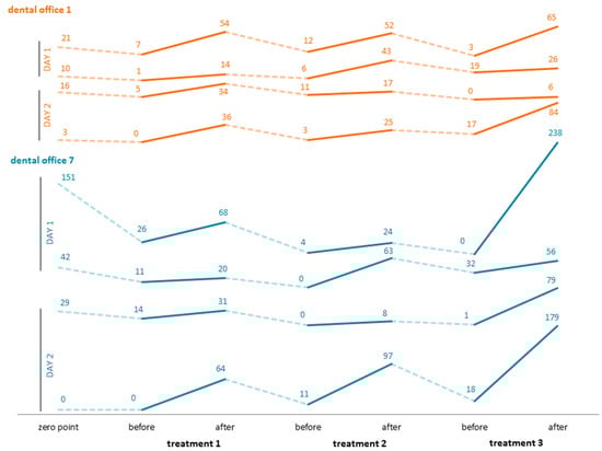 As shown in Figure 6, the increase in protein concentration after treatment is consistently detectable in each of the two offices. A negative difference between the preceding after-treatment value and the subsequent before-treatment value is clearly detectable. The final values following the third treatment of the first day are higher than the starting values of the second day following internal decontamination of the instruments. The highest protein load was found to be 238 μg/mL after the third treatment in dental office 7. The lowest concentrations were 0.0 μg/mL.