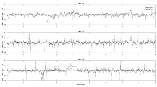 Head pose signals were acquired from the HTC sensors and downsampled to 90 Hz. No low-pass filtering was necessary. Quaternions were transformed into instantaneous yaw, pitch, and roll angles (world-centered head co-ordinates). For each trial, we also computed the instantaneous visual stimulus yaw, pitch, and roll angles, obtained by multiplying the corresponding head co-ordinates by the current gain (world-centered visual coordinates). With the unitary gain, the two sets of co-ordinates coincide in Figure 3. A convenient indicator of explorative head movements was obtained by computing, for each trial, the mean absolute horizontal head angular deviation from the straight-ahead direction (mean yaw, world coordinates). Similar results were obtained by using the mean horizontal head rotation speed. The corresponding visual exploration indicator (the ensuing horizontal deviation of the visual field) was computed by applying the same procedure to the visual co-ordinates. Eye movements were not recorded. Because of their positively skewed distributions at all gain values, head rotation and visual rotation data were log-transformed before performing statistical analyses.