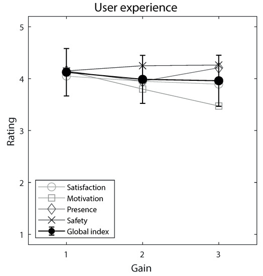 After the responses to the post-session SSQ were collected, participants were also asked to rate satisfaction, motivation, sense of presence, and perceived safety. All responses were given on a 5-point numerical rating scale, and the questions were formulated as follows: (1) “How much did you like this experience?”; (2) “How much would you repeat this experience?”; (3) “How much did you feel like being biking outdoors?”; (4) “How much did you feel safe during virtual biking?”, where 1 represented no sensation at all and 5 represented full sensation, the other ratings indicating intermediate levels. For each participant, the four ratings were then averaged into a global user experience index. The global index distributions at each gain value did not depart significantly from normality, as assessed with the Shapiro–Wilk test.