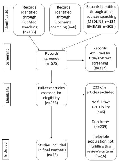 The present review was carried out by conducting an electronic search in OVID® (Ovid Technologies, Inc., Wolters Kluwer Health, NY, USA) (Medline and Embase) and PubMed® (National Library of Medicine, Bethesda, MD, USA), combining the following MeSH keywords: “pulmonary disease, chronic obstructive”, and “frailty”. The search was completed on 30 September 2022 and limited to publications posted in the last 5 years; in English and Spanish; and in human subjects aged 60 or older. A total of 575 articles were obtained, of which 25 were finally selected. Details of the evaluation and selection process of the items are shown in Figure 1.