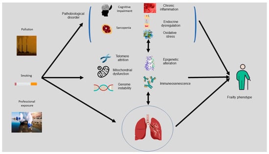 Likewise, COPD is the third leading cause of death worldwide. Many factors contribute to the development of COPD, including genetic factors (alpha1-antitrypsin deficiency), pollution, cigarette smoking, and occupational exposure to various chemicals. COPD manifests as an inflammatory disease that affects the airways, lung parenchyma, and pulmonary vasculature. Inhalation exposure can trigger an inflammatory response, leading to a decrease in forced expiratory volume and tissue destruction and eventually to airflow limitation. Airflow limitation is the main pathophysiological feature of COPD [11]. This relationship between the two may be because COPD and frailty share some risk factors, including aging, smoking, and inflammation [12] as well as clinical manifestations, such as fatigue, anorexia, muscle weakness, and slowed walking speed [13]. In this sense, Lahousse et al. suggested that both pathologies might have a single physiopathology in common [14].