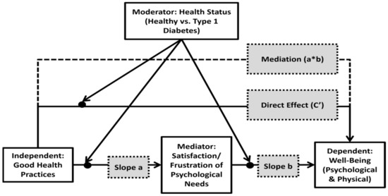 Thus, the current study proposes a conceptual model examining psychological and physical well-being that is related to good health practices among adolescents with T1D (Figure 1). The main research aims were threefold: (1) to examine differences in good health practices and in psychological and physical well-being between adolescents with/without T1D; (2) to examine the association between good health practices and satisfaction and frustration of psychological needs (Figure 1: slope a); (3) and to examine the mediating effect of satisfaction and frustration of basic psychological needs on the association between good health practices and psychological and physical well-being among adolescents with/without T1D (Figure 1: moderation–mediation effects).