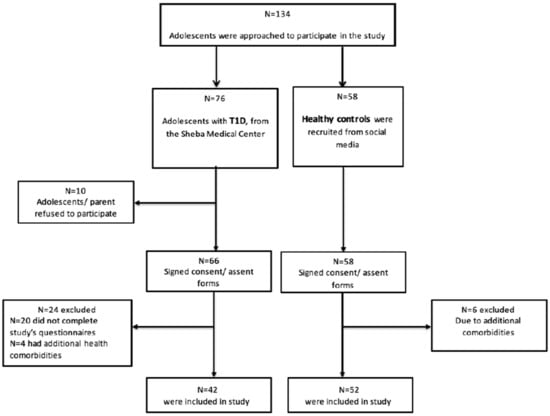 A total of 94 adolescents (ages 10–18 years) were recruited to participate in the study. Of these, 42 were diagnosed with T1D (mean ± SD age = 14.8 ± 2.06; 54.8% females) and 52 were healthy controls (mean age= 14.8 ± (1.63); 57.7% females). The T1D participants were recruited from the Pediatric Endocrinology and Diabetes Unit at the Edmond and Lily Safra Children’s Hospital, Sheba Medical Center, Israel, and the healthy controls were recruited from the general population via social media. A detailed advertisement (approved by the Ethical Review Board) was published on social media via Facebook and WhatsApp groups, describing the study’s purpose, requirements, need for parental consent and the researcher’s contact information for further details. In addition, participants notified that they will be reimbursed for their participation with a USD 10 gift card (see Figure 2 for participants’ flow-chart and Table 1 for a detailed description of sample characteristics).