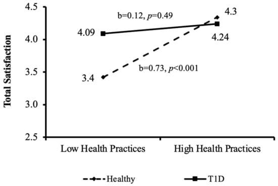 The interactions between good health practices and levels of total satisfaction and total frustration according to health condition groups (aim 2) are also depicted in Figure 3 and Figure 4. As can be seen in Figure 3, positive significant associations between good health practices and total satisfaction were found for the healthy control group (b = 0.73, p < 0.001), but not for the T1D group.