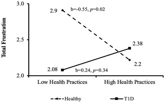 As can be seen in Figure 4, significant negative associations between good health practices and total frustration were found for the healthy control group (b = −0.55, p < 0.02), but not for the T1D group.