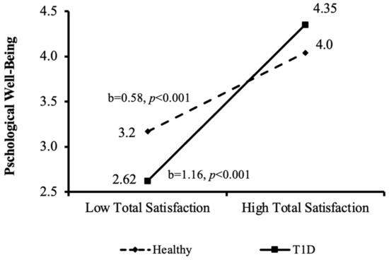 Interactions decomposition of the mediating variable (satisfaction) effect on the dependent variable (psychological well-being) according to the moderating variable (health condition groups). T1D = type 1 diabetes.