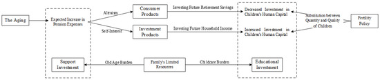 The impact of the dual pressures of old age and childcare on human capital educational investments revolves around the motivation of intergenerational relationships [38]. The existence of both altruistic and self-interested motives between generations leads to a dynamic balance between these investments and returns [39,40]. This results in the intergenerational nature of family human capital investments: parents invest in their children’s education expecting that they in return will provide them healthcare and social security human capital expenditures in their old age [41,42]. Figure 1 illustrates the decision-making mechanism of households’ human capital investments. Out of altruism, decision-making members view their children’s human capital as a durable good [43]. As society ages and the pressure to support the future population of older adults increases, households must exchange resources among family members of different ages when the household income is constrained [19]. When anticipated old-age expenditures increase, households may favor the use of savings to meet future old-age expenses, which also implies that these expenses will overtake any investments in children’s human capital [44].