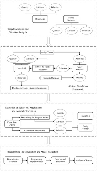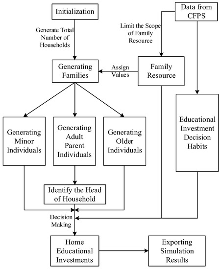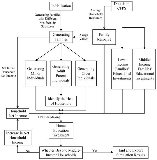 The multi-agent simulation, or multi-agent system (MAS) simulation, solves large-scale complex problems beyond the capability of a single subject by forming an interactive group of multiple subjects. The MAS is a complex system, in which each individual is independent of the other and has its own set of strategies. Within the system, each individual evaluates their own state according to environmental changes and feedback mechanisms and decides to either change the state of their attributes or to react. The interactive relationship between individuals provides an evolutionary process for complex systems. Through overall emergence, this ultimately achieves the main goal of the system or affects the external environment of the system. A computer simulation can observe this duality of internal and external strategies and offer a reference for the information value in real system operations. In this study, we constructed three-generation “sandwich” families with different resource endowments and membership structures through a multi-agent simulation approach. These simulated households form their own educational investment decisions based on their resource endowments. Simultaneously, we dynamically analyzed the changes in educational investment decisions of households with different membership structures with changes in income. Figure 2 illustrates our process for the multi-agent simulation.