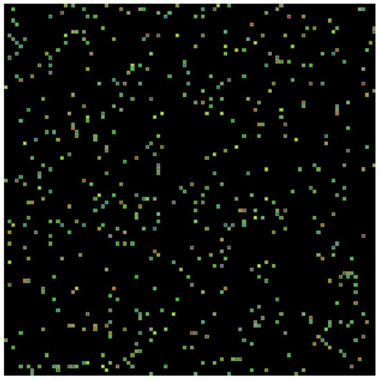 In the model’s initialization process, the household resource endowment is set based on the CFPS database, and the corresponding variables’ range of values are noted by the range of value changes. The obtained resource endowment determines how the households in this simulation generate family members and indicates the head of household candidates; furthermore, household educational investment decisions are made based on the education investment habits formed by the regression results in Table 2 (Model 1-4). Figure 3 presents the simulation working area, whereas Figure 4 illustrates the main process. In Figure 3, the green squares represent each family’s location, as measured by horizontal and vertical coordinates; the small markers with colors represent the members generated in the family. Table 6 displays some of the households’ resource endowments and simulated investment results.