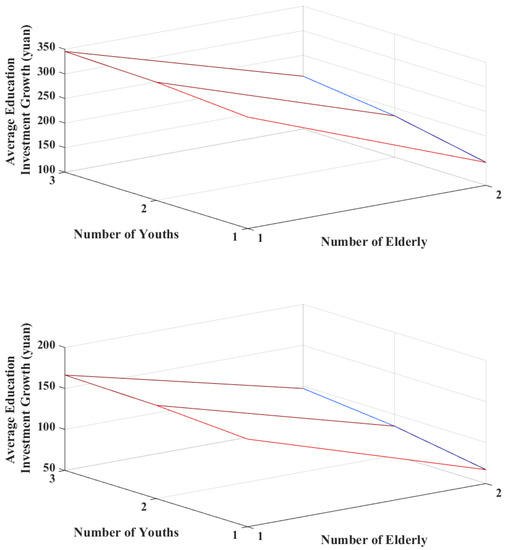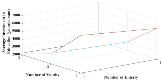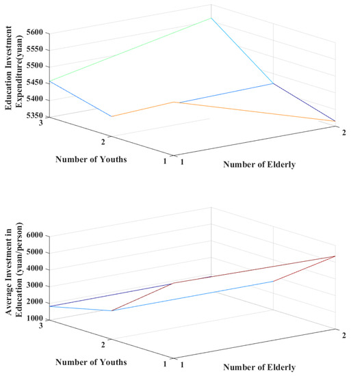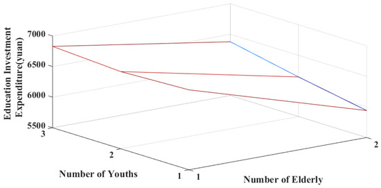 Figure 6 and Figure 7 consider the previously noted settings to partially reveal the simulation results of households’ educational investments. Figure 6 presents the variations in educational investments among low-income families, with members composed if the family’s annual net income is ¥25,000. Figure 7 illustrates the variation in educational investments among middle-income families and the members’ age structure if the family’s annual net income is ¥55,000. Low-income households have less variation than middle-income households in both educational investment expenditures and per capita educational investment expenditures; the means of both are also relatively lower. This is consistent with the previously described regressions for the different income classes. Among the personnel structure of households in the low-income bracket, educational investments are most affected by households with one adolescent and two older individuals, and two adolescents and one older individual. From the person-ratio perspective, families with a substantial older adult burden and less childcare pressure and those with high childcare pressure and less of an older adult burden should focus more on the family’s future human capital investments. Among the personnel structures of middle-income households, education expenditures are most profoundly affected by households with one youth and two older individuals. From the household composition perspective, households with a more substantial older adult burden and low childcare pressure need to focus more on their future human capital investments. Comparing the per capita education investments of low- and middle-income families indicates that the most affected families are those with high childcare pressures. These families must focus more on the unequal distribution of family education resources among children.